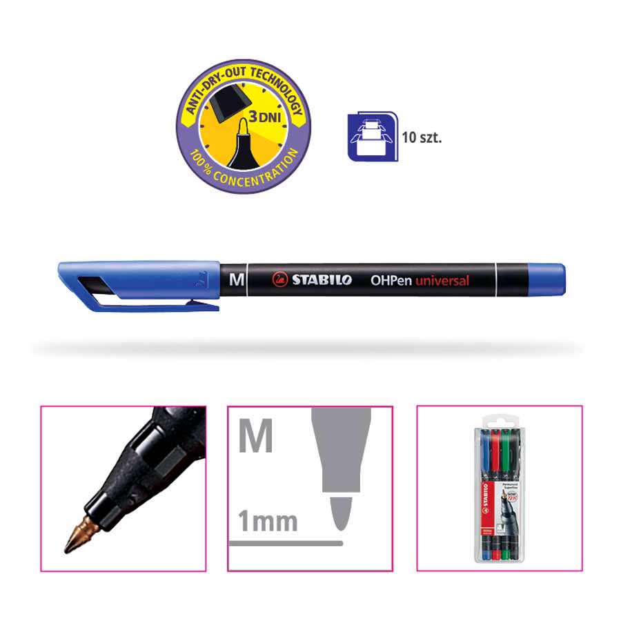 - odpowiedni do pisania na folii do projektorów i wszystkich rodzajach gładkich powierzchni – CD, metal, szkło, plastik (PP, PET, PVC itd.)