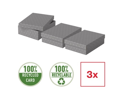 Zestaw trzech średniej wielkości tekturowych pudełek do przechowywania ze stylowym i nowoczesnym geometrycznym wzorem na powierzchni.