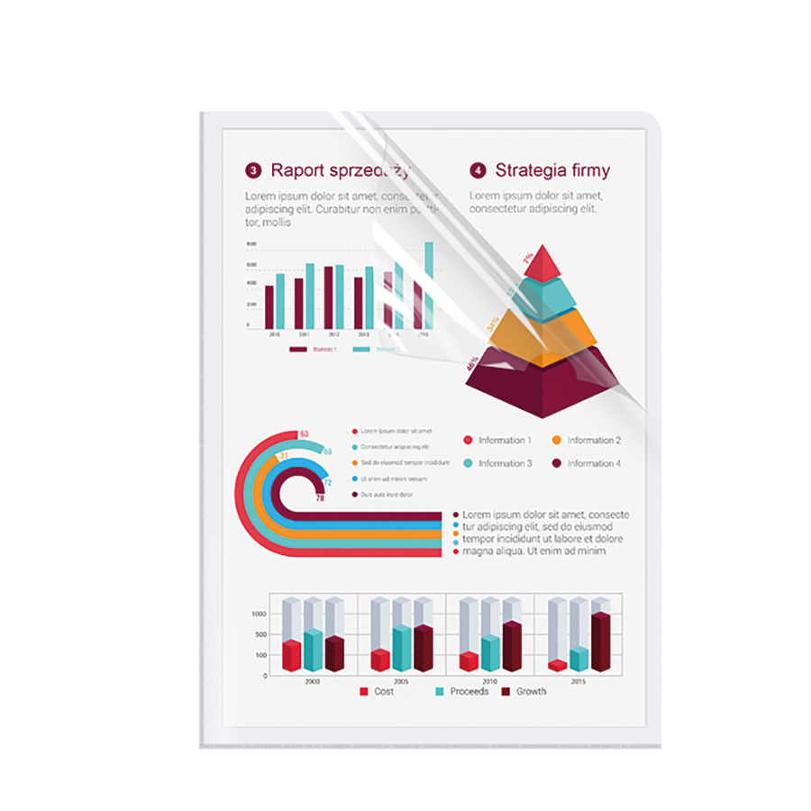 Ofertówka Biurfol została zgrzana w literę “L”, co pozwala na łatwe wkładanie i wyjmowanie dokumentów. Idealnie nadaje się do przechowywania dokumentów w formacie A5.