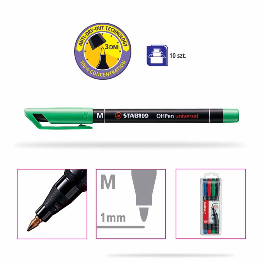 - odpowiedni do pisania na folii do projektorów i wszystkich rodzajach gładkich powierzchni – CD, metal, szkło, plastik (PP, PET, PVC itd.)