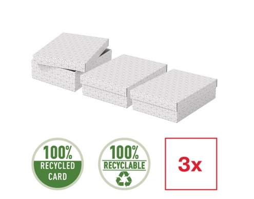 Zestaw trzech średniej wielkości tekturowych pudełek do przechowywania ze stylowym i nowoczesnym geometrycznym wzorem na powierzchni.