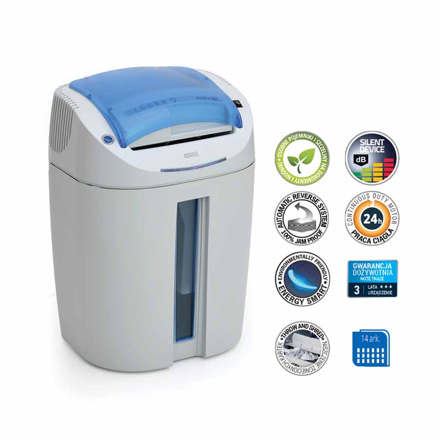 Niszczarka została wzbogacona o funkcję niszczenia plastikowych kart, zszywek oraz spinaczy, co czyni ją wszechstronnym narzędziem, które sprosta różnorodnym potrzebom biurowym. Szeroka szczelina wejściowa jest idealnie dostosowana do dokumentów formatu A4, co zapewnia wygodę użytkowania i oszczędność czasu. Dzięki zaawansowanemu systemowi tnącemu, który posiada 5-letnią gwarancję, można być pewnym, że urządzenie spełni swoje zadanie przez długi czas, niezawodnie chroniąc poufne informacje.