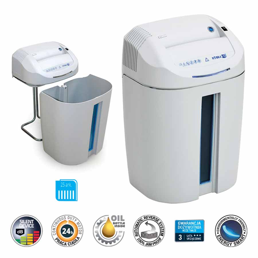 - automatyczne odcięcie zasilania w przypadku zaklinowania papieru lub wyjęciu pojemnika na ścinki