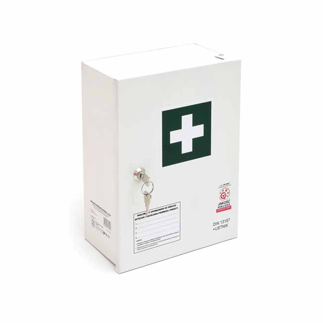 przenośna apteczka przeznaczona do zakładów pracy typ K-15.2 z wieszakiem montowanym na ścianę w pudełku z wytrzymałego tworzywa sztucznego ABS z uchwytem do wygodnego mocowania na ścianie wyroby medyczne oznakowane znakiem CE apteczka spełnia wymagania norm Unii Europejskiej termin ważności produktów sterylnych wynosi 5 lat wyposażenie: DIN 13157 + aparat do sztucznego oddychania zawiera: - plaster na szpulce 5m x 2,5cm – 1 szt. - zestaw plastrów (5 rodzajów) – 42 szt./1 opak. - bandaż z kompresem (opatrunek indywidualny) 6cm x 8cm – 1 szt. - bandaż z kompresem (opatrunek indywidualny) 8cm x 10cm – 3 szt. - bandaż z kompresem (opatrunek indywidualny) 10cm x 12cm – 1 szt. - chusta opatrunkowa 60cm x 80cm – 1 szt. - kompres na rany 10cm x 10cm – 6 szt./3 opak. - kompres na oko 5cm x 7,5cm - 2 szt. - zimny kompres – 1 szt. - koc termiczny (ratunkowy) 210cm x 160cm – 1 szt. - bandaż elastyczny 4m x 6cm – 2 szt. - bandaż elastyczny 4m x 8cm – 2 szt. - chusta trójkątna 96cm x 96cm x 136cm – 2 szt. - nożyczki – 1 szt. - worek foliowy – 2 szt. - chusta z fizeliny 20cm x 30cm – 5 szt./1 opak. - chusteczki nasączone – 4 szt. - rękawiczki jednorazowe - 4 szt. (2 pary) - maska medyczna – 2 szt. - instrukcja udzielania pierwszej pomocy – 1 szt. - aparat do sztucznego oddychania wymiary: 330 mm x 245 x 125 mm kolor: pomarańczowy