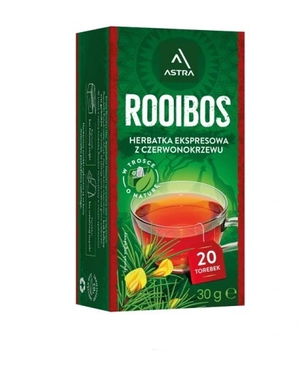 Herbata Rooibos Astra to wysokiej jakości napar z południowoafrykańskiego krzewu, znany z delikatnego, słodkawego smaku i naturalnej łagodności. Nie zawiera kofeiny, dlatego doskonale sprawdzi się jako propozycja do biura, hotelu, gastronomii czy sklepu spożywczego. Każde opakowanie zawiera 20 szczelnie zapakowanych torebek, gwarantujących świeżość i pełnię aromatu.