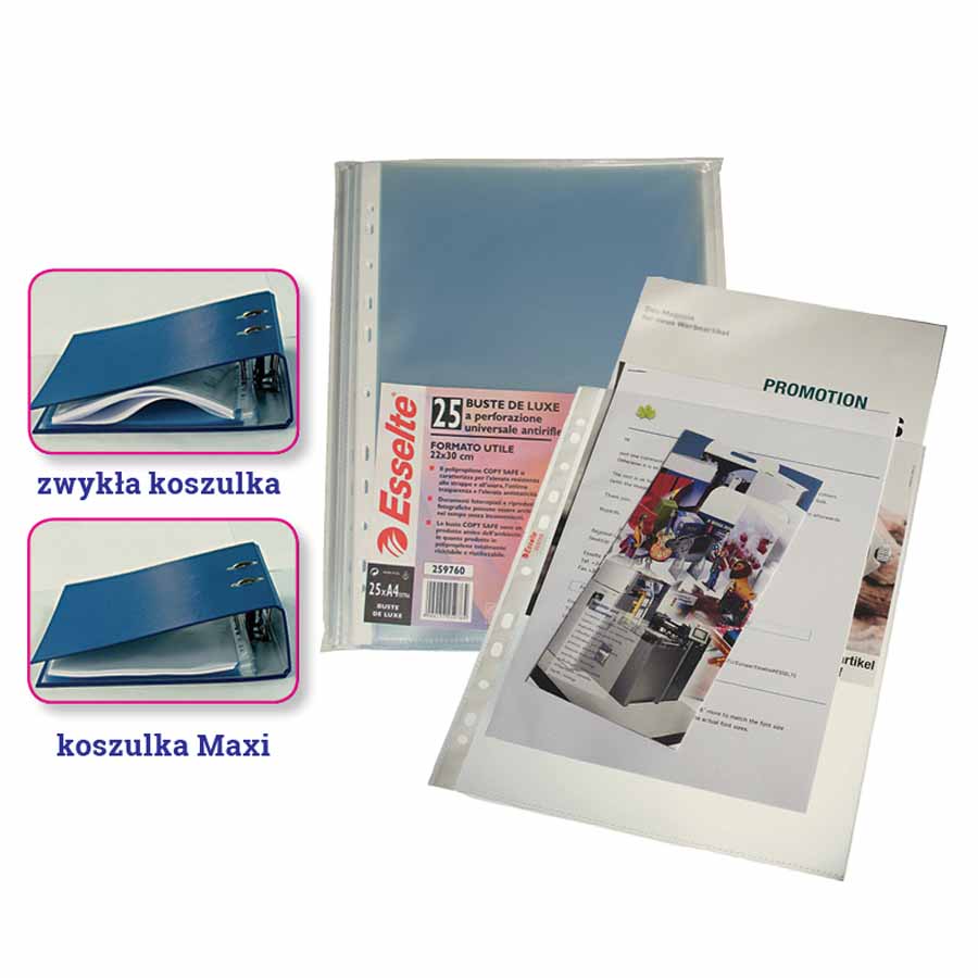 Koszulki są wyposażone w boczną klapkę, która ułatwia wkładanie i wyjmowanie dokumentów, jednocześnie zapobiegając ich przypadkowemu wysunięciu. To praktyczne rozwiązanie zapewnia dodatkowe zabezpieczenie dla przechowywanych materiałów, co czyni je idealnym wyborem do organizacji ważnych dokumentów.